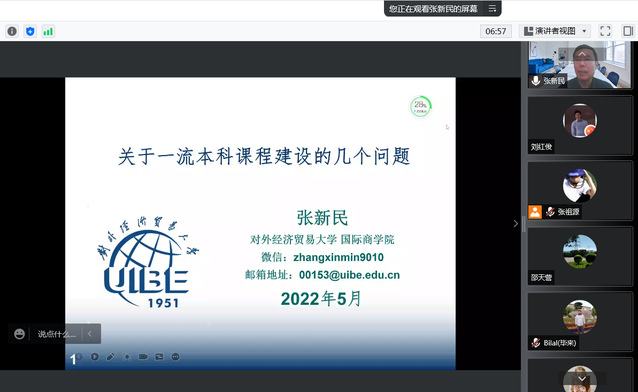 2022年5月19日下午3:30,财政部“中国会计名家”、教育部高等学校会计学专业指导分委员会副主任委员、对外经济贸易大学博士生导师张新民教授在线上做题为“关于一流本科课程建设的几个问题”的报告。学院领导及全体专任教师参会,学院副经理曾义主持会议。