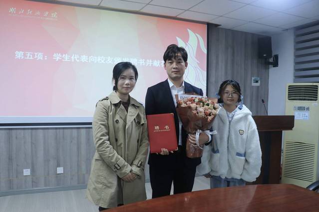 会计2442班为员工王旭升颁发了学校发放的荣誉班主任聘书,并献花。