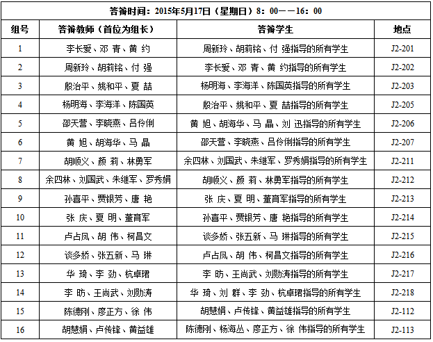 根据《太阳成集团122cc官网入口本科毕业论文(设计)答辩工作程序》的要求,经太阳成集团122cc官网入口本科毕业论文答辩委员会研究决定,对2015届本科毕业论文答辩工作安排如下: