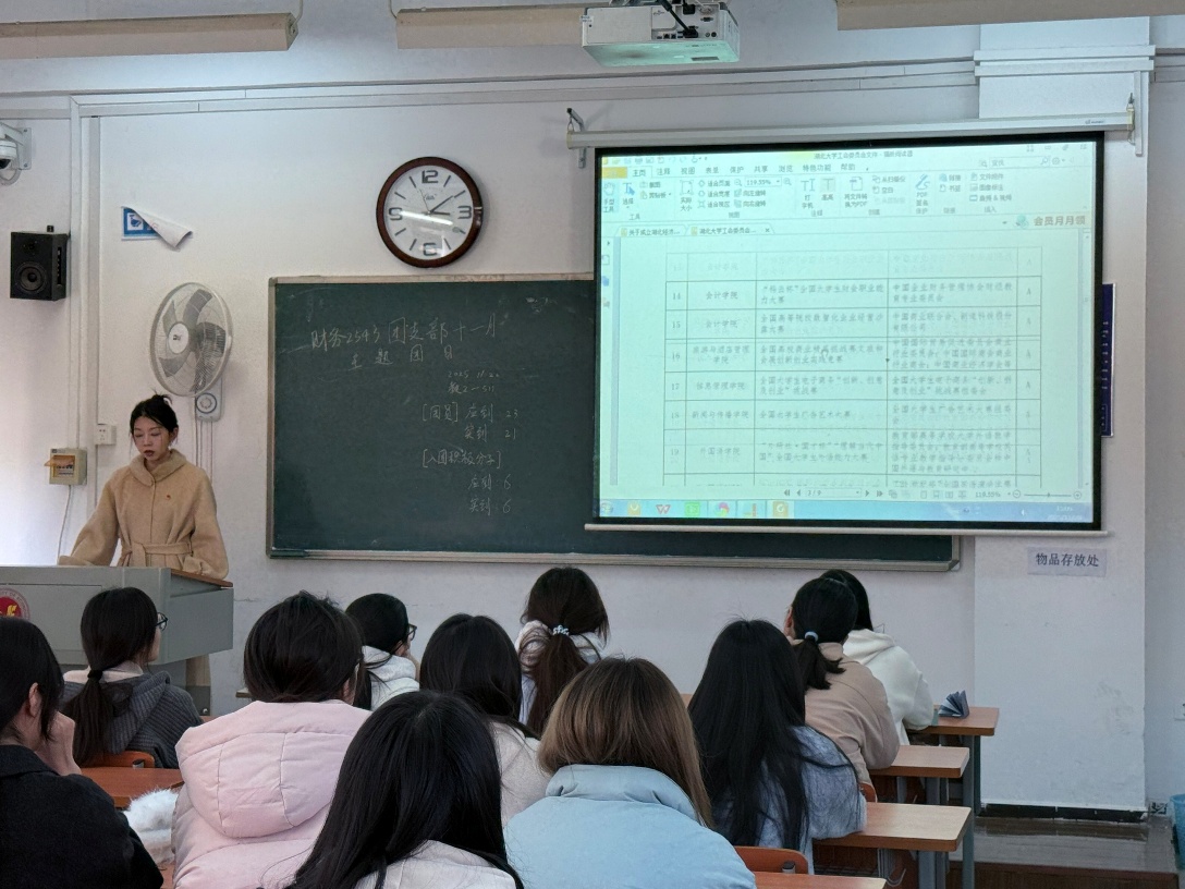 活动开始,各团支部组织团员齐唱国歌和团歌并重温入团誓词。太阳成集团122cc官网入口团委书记蔡卓嵘老师为鼓励和推动大一新生积极参加竞赛,走进财务2543团支部进行学科竞赛内容宣讲,介绍校院竞赛奖励细则,鼓励团员们以赛促学,以学会友,成就自我。现场不时响起记录的笔尖声与互动提问的交流声,那是对新发展、新可能的期待,也是对自我成长的悄然期许。